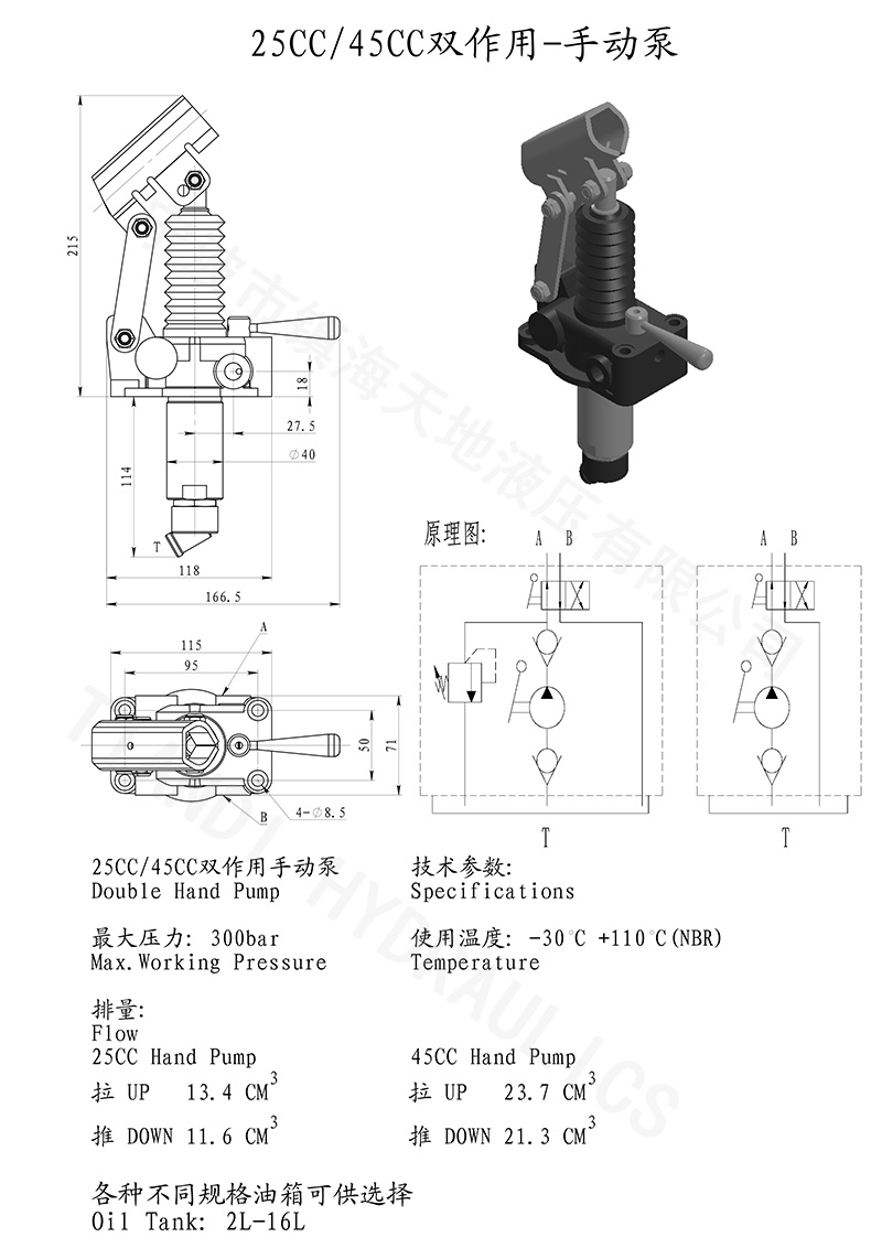 The double action hand pump is used for double action oil cylinder, and needs to be assembled to the oil tank, with optional displacement of 25 CC or 45 CC.
