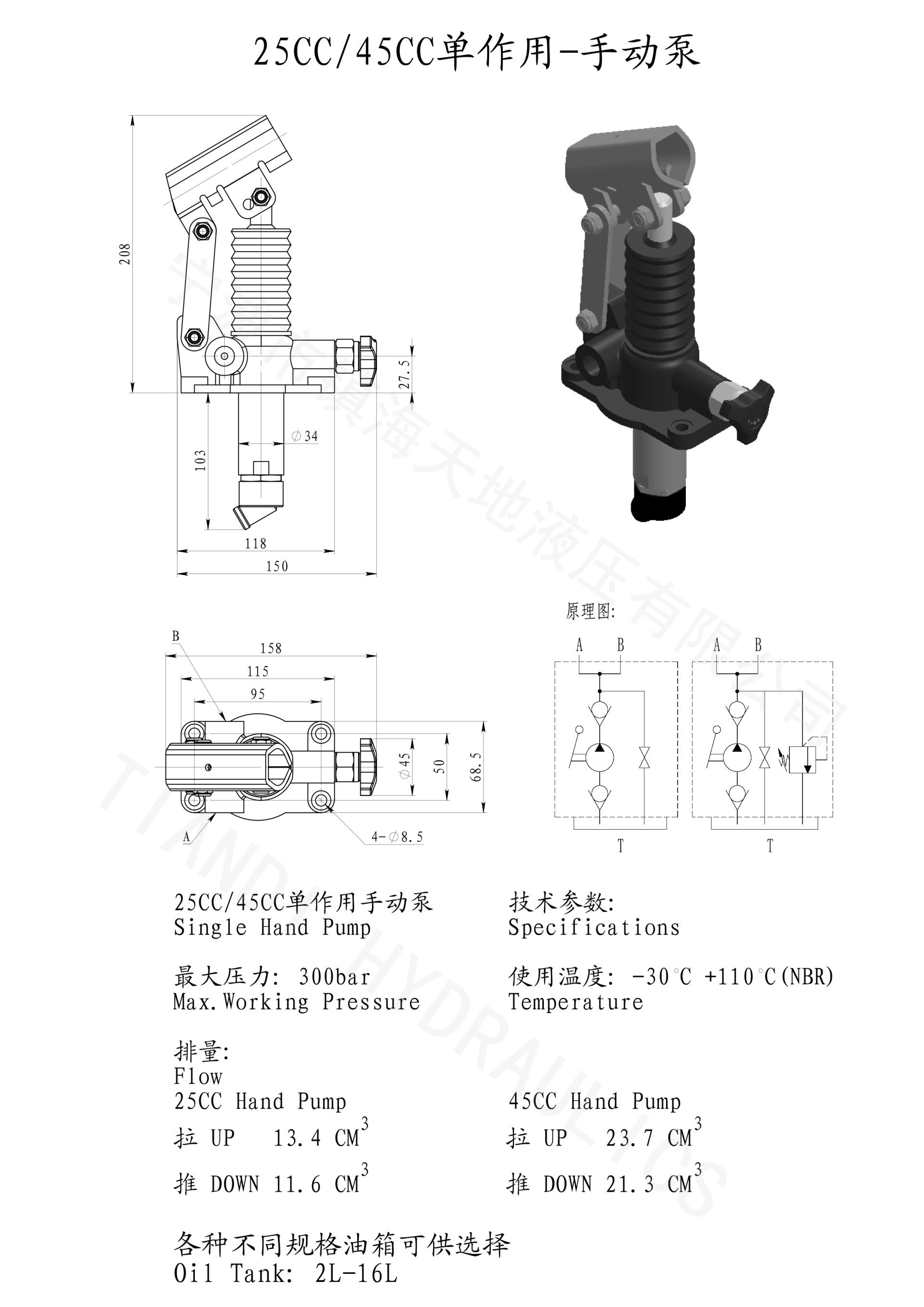 The single action hand pump is used for single action oil cylinder, and needs to be assembled to the oil tank, with optional displacement of 25 CC or 45 CC.