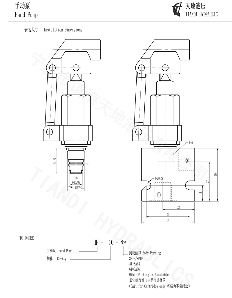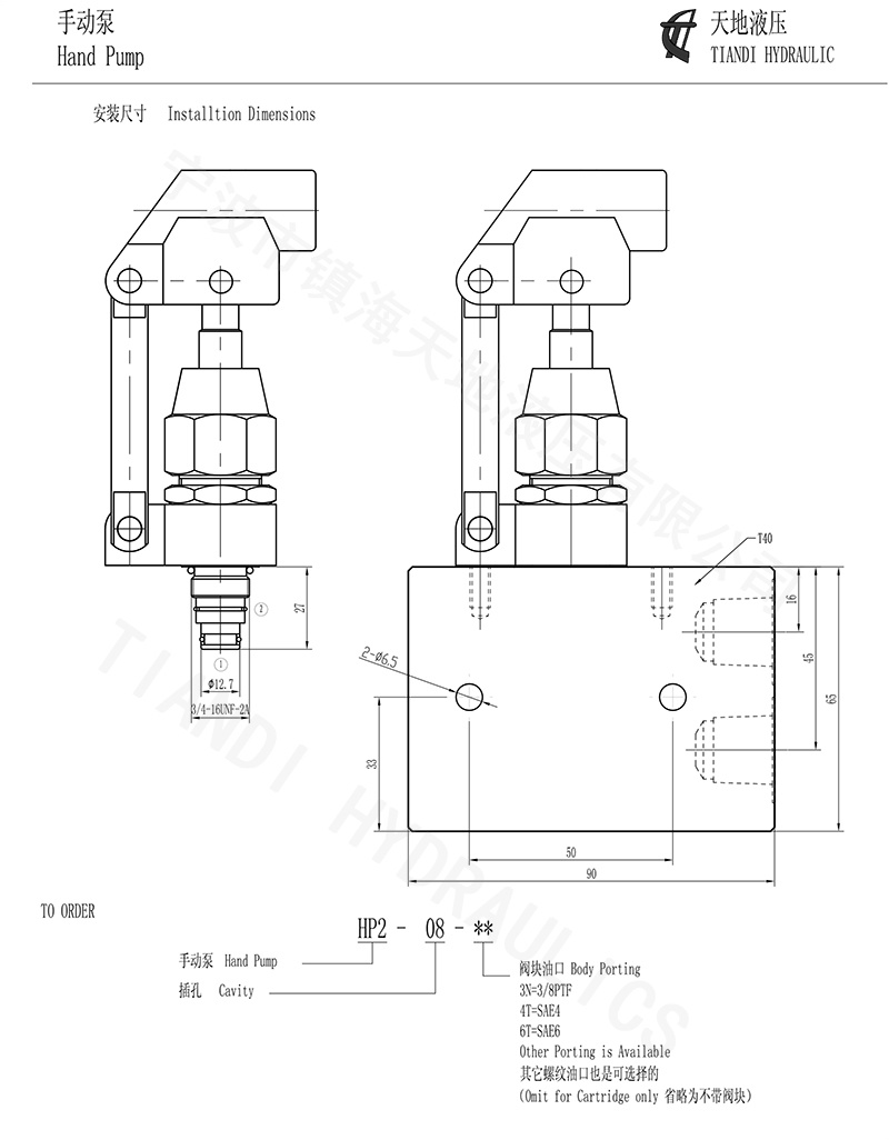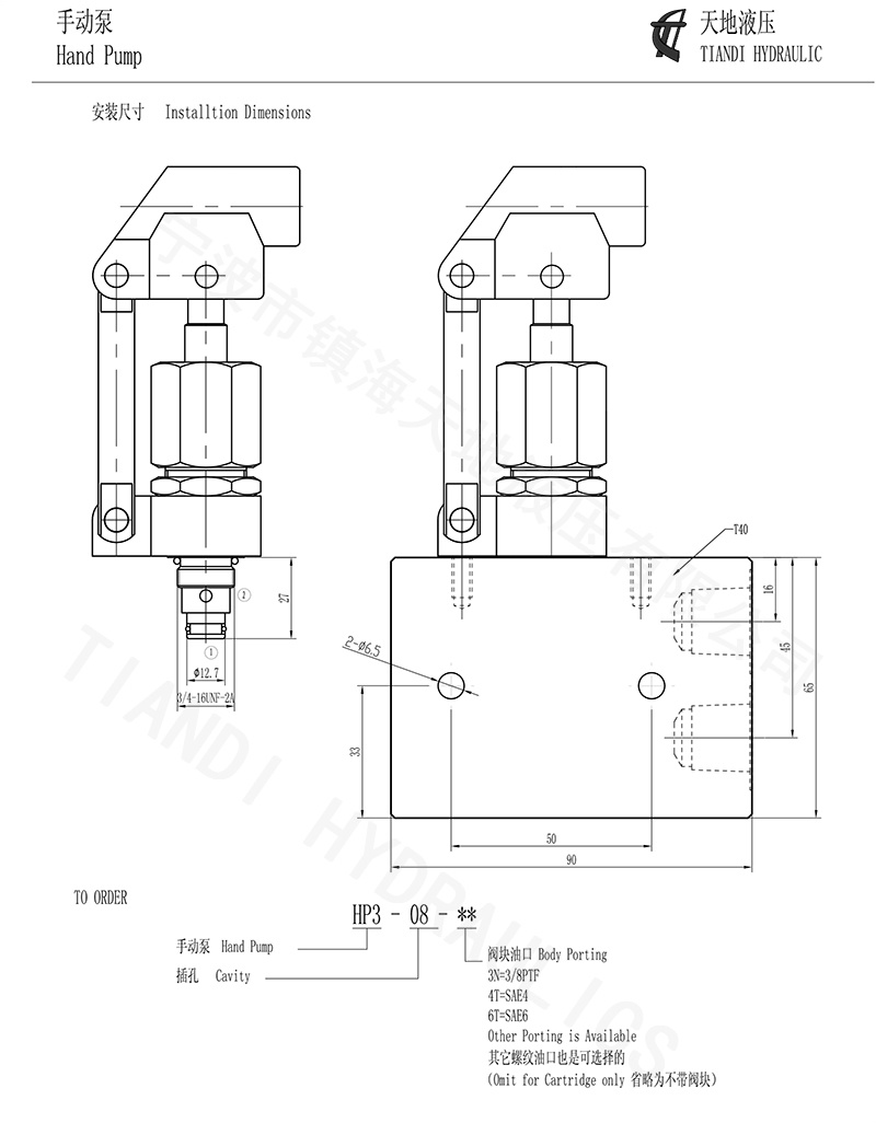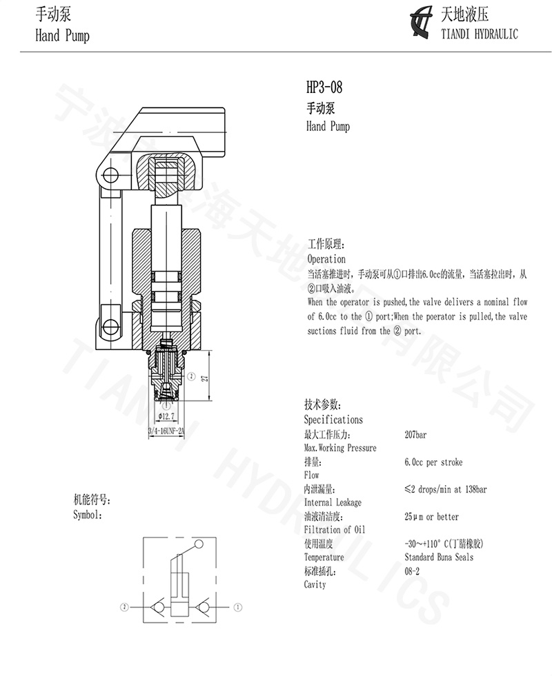 HP3-08: hand pump: adopts 08-2 socket. Absorb oil from port ② and drain oil from port ①. The displacement is 6.0 CC.