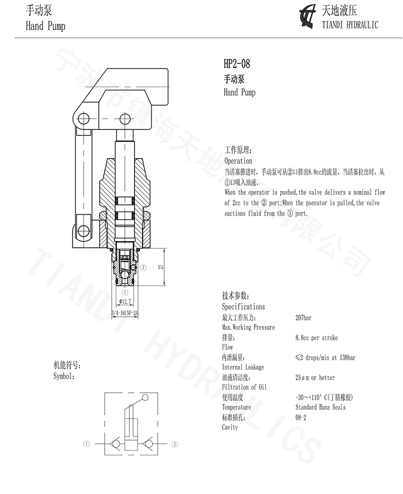 HP2-08: hand pump: adopts 08-2 socket. Absorb oil from port ① and drain oil from port ②. The displacement is 8.8 CC.