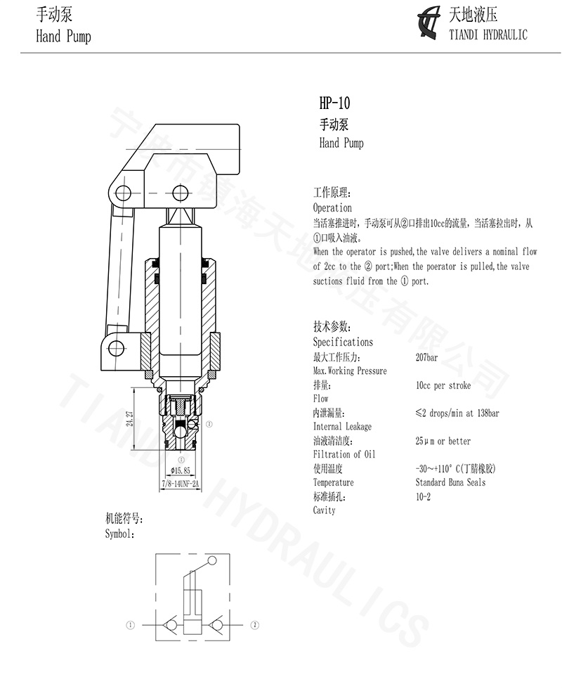HP -10: hand pump: adopts 10-2 socket. Absorb oil from port ② and drain oil from port ①. The displacement is 10 CC.